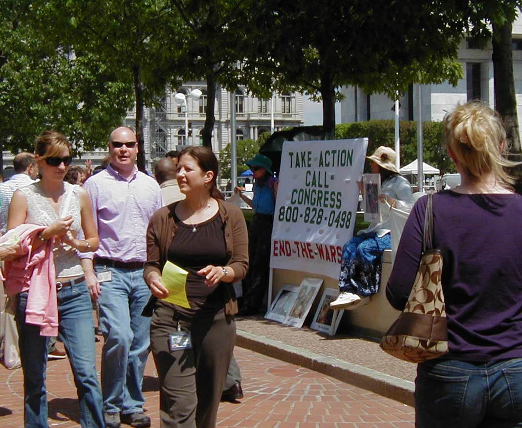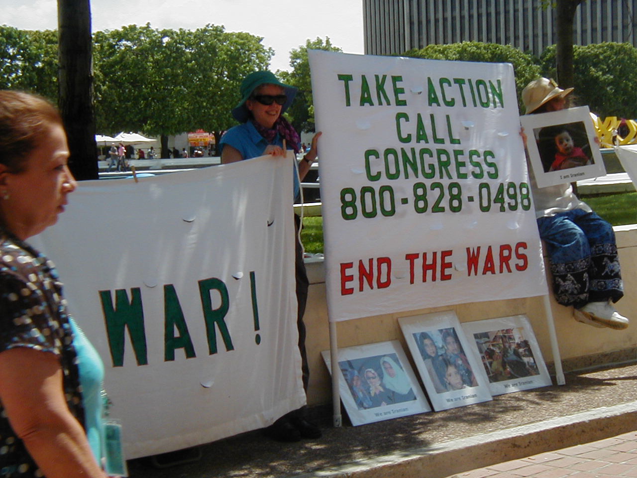 This lunch hour food festival demonstration reached thousands of festival goers. This year more people stopped to engage us in conversation. Priscilla Fairbank had created an excellent leaflet that discussed oppositon to House Concurrent Resolution 362, "The Iran blockade resolution" and gave phone numbers, email information and our website for more background information. On the other side of the leaflet she quoted from voices calling for diplomacy.