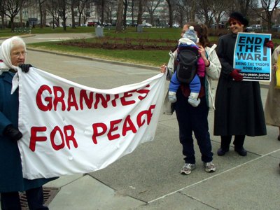 | On Wednesday, April 18th, 2007, Grannies for Peace, a project of Women Against war, joined with Peace Action and Albany Friends Meeting in sponsoring this special vigil and leafleting campaign that brought attention to the link between tax day and the need to cut off funds for the Iraq War. Our Albany Vigil was part of a network of actions coordinated across the country by Bay Area Grandmothers Against the War. We are pleased that Code Pink, of which we are a local affiliate, also organized events nationwide to link Iraq and taxes. |  |