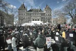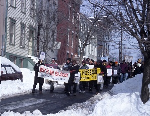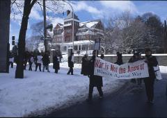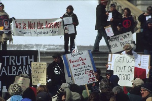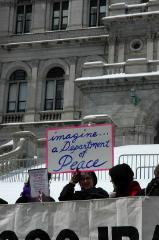 | | Remembering the Fallen March Women Against War joined other peace groups to sponsor a Remembering the Fallen March on March 18, 2007, to mark the Iraq War’s 4th anniversary. Participants signed up in advance to carry the name of one of the more than 3,700 US soldiers who have died in Iraq, learning about their individual lives and the terrible loss of these deaths. |  | | A huge crowd, estimated by Channel 10 as 3000 persons, gathered for a rally in front of the NYS Capitol and a march to the Federal Building. |  | | WAW activist, Maureen Aumand, came up with this powerful idea of honoring each lost life and spoke for WAW at the rally. A huge banner reminded us all that over 650,000 Iraqis gave died since the US invasion. | | To bring the day’s message into a residential neighborhood, we organized a WAW Feeder March through the Mansion Hill area. 70 WAW members, friends and family walked in silence, in pairs, dressed in black and carrying our names to symbolize our mourning. Contingents form WAW’s project, Grannies for Peace, and the Muslim Solidarity Committee, which WAW strongly supports added to the power of the Feeder March. |  |
