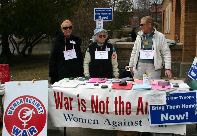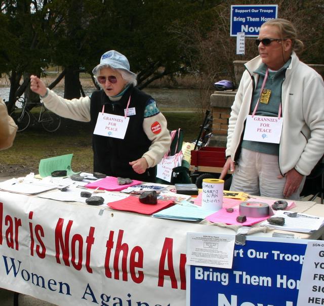 Grannies for Peace, a project of Women Against War, has created a flier linking war and global warming, that was handed out at the event. Several grannies copied the fliers for distribution in their communities or churches. There's a lot of attention right now on global warming, so feel free to download the flier and distribute it in your office, neighborhood, faith community or at a global warming event in your area.