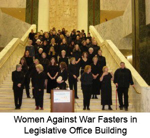 Our earliest activity was a team effort that set a high standard. For 90 days, from December 2002 to March 2003, women fasted for peace one at a time, showing up at The Women's Building in Albany to spend 24 hours as testament to an individual - and shared - commitment to peace. Each woman spent the night alone in the big building, after the offices and meeting rooms were empty, and woke up in the morning with no one to distract her from the hunger that was starting. I was a weekend faster, and by mid morning, with no coffee and no one working in the building, I started to feel a little melancholy. But I had brought good reading, and I was interested in the street scene outside, so the day didn't drag much. A friend who was not a faster, and has never gotten involved in Women Against War, came to spend a couple hours with me in the afternoon, just chatting about our usual interests. But she must have a lingering notion of the seriousness of Women Against War, and a feeling that she helped me with my oddball exercise in protesting the march to war.